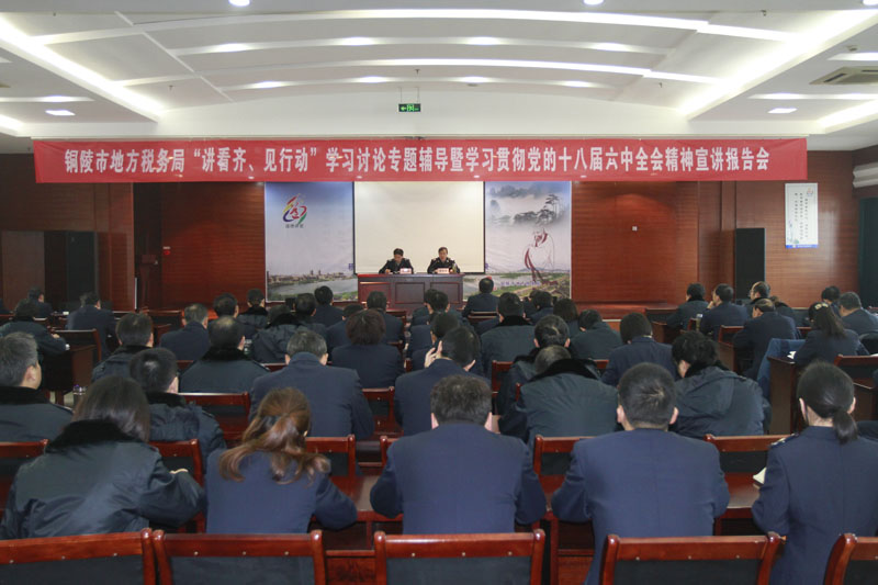 为深入学习贯彻党的十八届六中全会精神,认真落实省局党组、市委关于“讲看齐、见行动”学习讨论工作安排部署,12月16日上午,市地税局召开“讲看齐、见行动”学习讨论专题辅导暨学习贯彻党的十八届六中全会精神宣讲报告会。