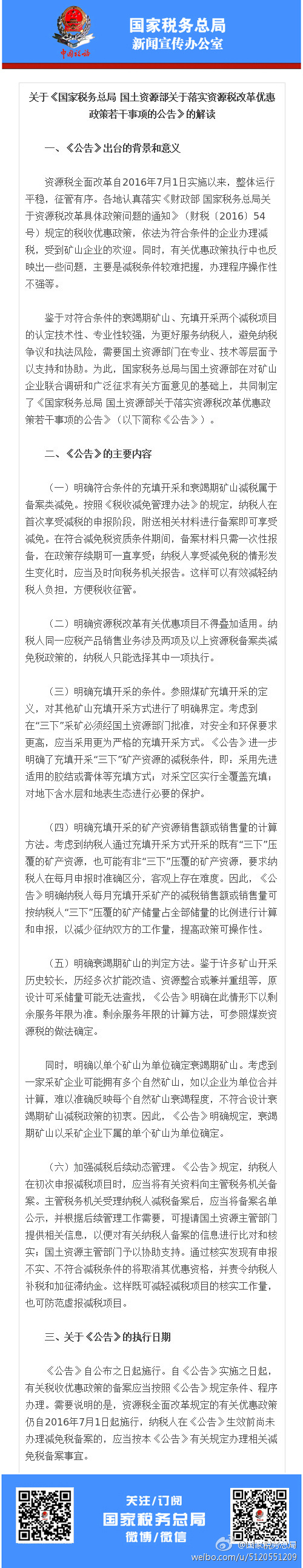 关于《国家税务总局 国土资源部关于落实资源税改革优惠政策若干事项的公告》的解读